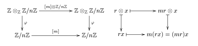 一方, $\mathbb{Z}$ 加群としての同型 $$ \varphi: \mathbb{Z}\otimes_{\mathbb{Z}}\mathbb{Z}/n\mathbb{Z}\rightarrow\mathbb{Z}/n\mathbb{Z}, \quad r\otimes x\mapsto rx $$ より, 図式